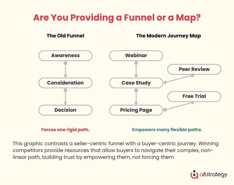 Another area ripe for evolution is your sales process. You may be trying to guide customers down a rigid, linear path that serves your needs, but this is no longer how people buy. This is a common area where businesses discover what competitors do better in sales. They've embraced the chaos of the modern buyer's journey, which Gartner research confirms is complex and self-directed. Instead of forcing a funnel, they provide a map and a compass.